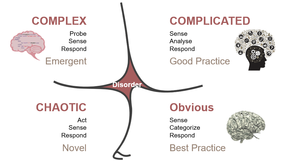 In the middle of the diagram is “Disorder”. This is when you don’t know which category you are in. Most often you end up in disorder because you evaluated a problem at the wrong quadrant and “fell off the edge” between Obvious and Chaotic. Problems move clockwise around the framework. You don’t have the ability to sense the problem and until you can, you can’t respond.