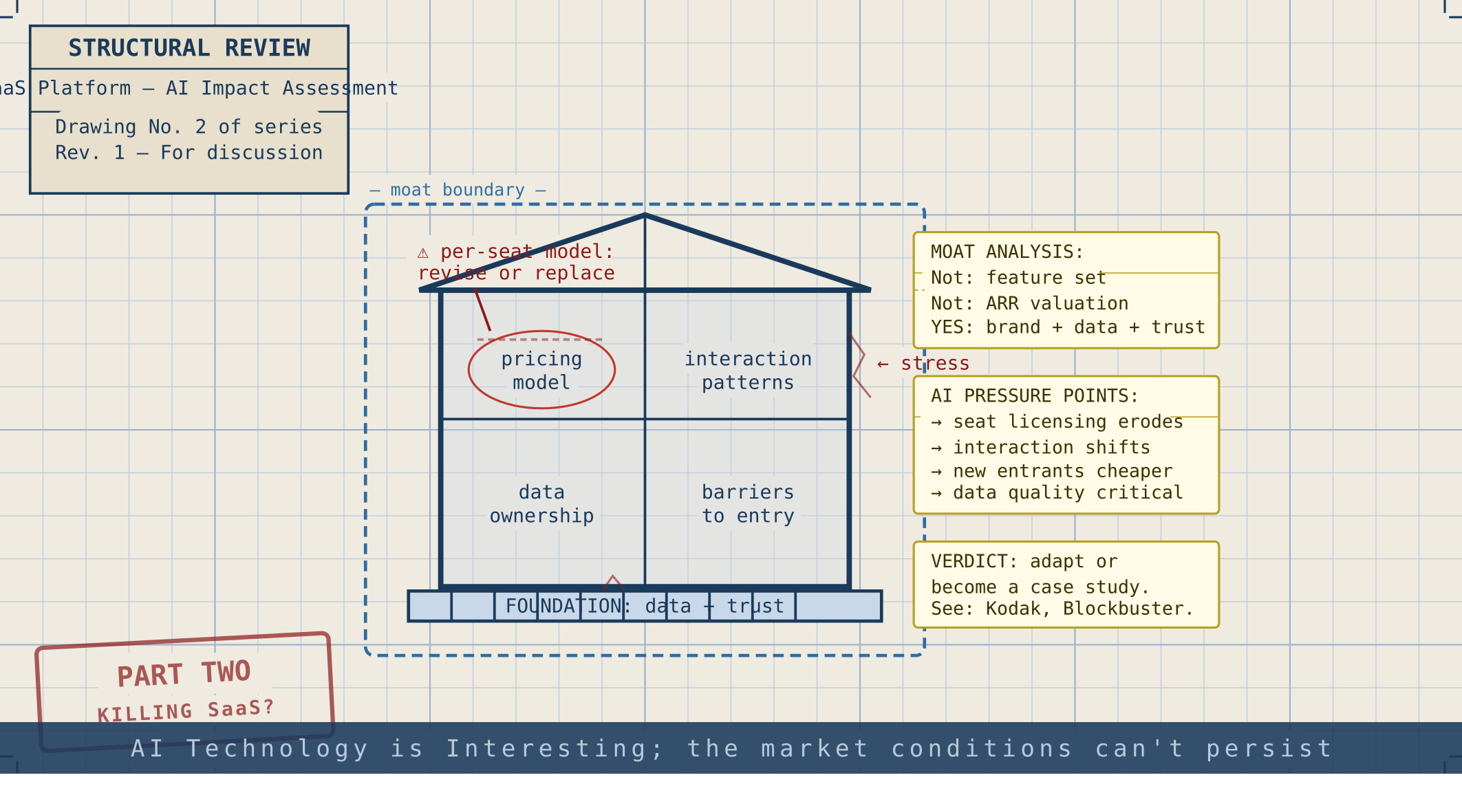 AI is fundamentally changing the landscape of software development. There are risks to the business models and monetization structures behind the companies building the AI superstructures. There are also fundamental changes to the way we build software and that increased speed of delivery shifting the conversations engineering, product, and the business need to have (which I will put in a pin in and probably take up in a different post). In this post, I want to talk abouts the impacts to existing software offerings and companies, regardless of whether they start to use AI tooling or AI-first approaches.